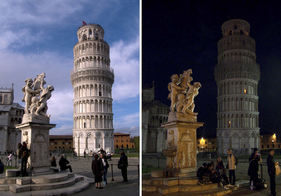 由世界自然基金會(huì)發(fā)起的“地球一小時(shí)”環(huán)保活動(dòng)27日20點(diǎn)30分按照時(shí)區(qū)依次在全球數(shù)千個(gè)城市展開。圖為意大利比薩斜塔在熄燈前和熄燈后的景色。
