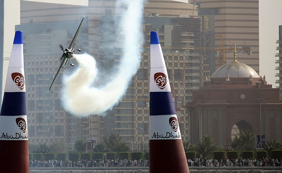近日,紅牛飛行系列賽世界錦標(biāo)賽預(yù)選賽在阿拉伯聯(lián)合酋長(zhǎng)國(guó)阿布扎比舉行。參加比賽飛行員不但要有高速的駕駛技術(shù),還要有勇往直前的膽量。圖片來源:中國(guó)新聞網(wǎng)