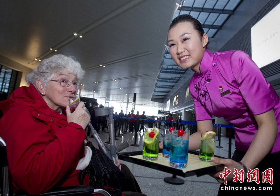 3月25日,上海虹橋機(jī)場T2航站樓。上航世博金牌示范乘務(wù)員徐翼邀請(qǐng)一名坐在輪椅上的外國旅客品嘗“世博特飲”。劉行喆/CFP