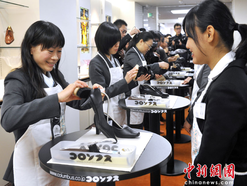 4月1日,日本一家鞋油廠新員工在入職儀式上為老員工擦鞋。圖片來(lái)源:中國(guó)新聞網(wǎng)