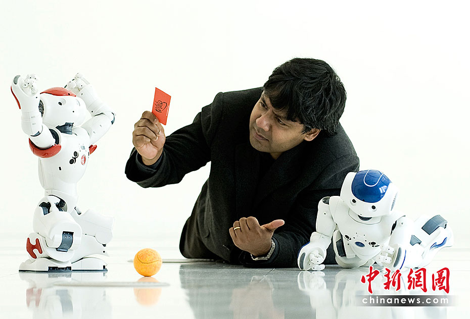 機(jī)器人足球隊(duì)在英國愛丁堡國際科學(xué)節(jié)亮相,它們由愛丁堡大學(xué)研制而成。機(jī)器人足球隊(duì)員內(nèi)置處理器可以感受周圍的環(huán)境和其他機(jī)器人的反應(yīng)。圖片來源:中國新聞網(wǎng)