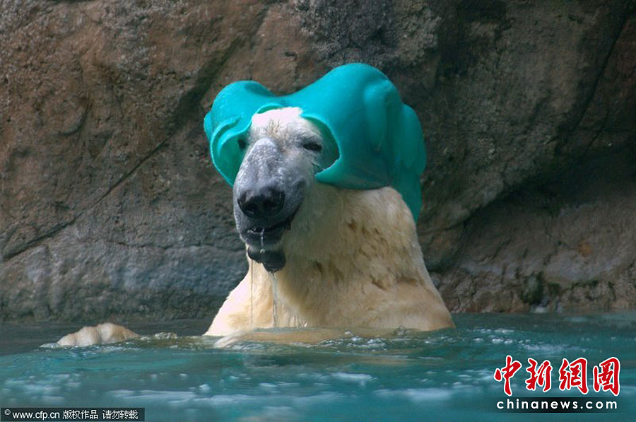 美國(guó)Asheboro北卡羅來(lái)納動(dòng)物園一頭名叫威利的北極熊可是個(gè)“活寶”。任何一個(gè)可用的東西都能成為它在鏡頭前“耍寶”的玩具。圖片來(lái)源:CFP
