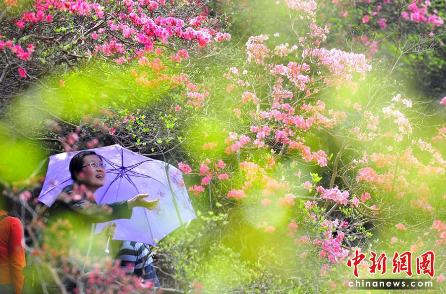 2010年4月4日,湖北武漢市黃坡區(qū)云霧山萬(wàn)畝杜鵑花競(jìng)相怒放,迎接八方游客踏青賞花。宋建春/CFP