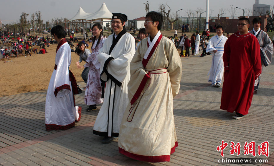 4日,通過網(wǎng)絡(luò)結(jié)交崇尚漢文化的青年網(wǎng)友相約在棗莊東湖公園,一起切磋漢文化。當(dāng)日,通過網(wǎng)絡(luò)結(jié)交崇尚漢文化的14名青年網(wǎng)友,利用清明小長(zhǎng)假相約在山東省棗莊東湖公園,身著漢服踏青交友,感受漢文化。中新社發(fā) 吉 喆 攝