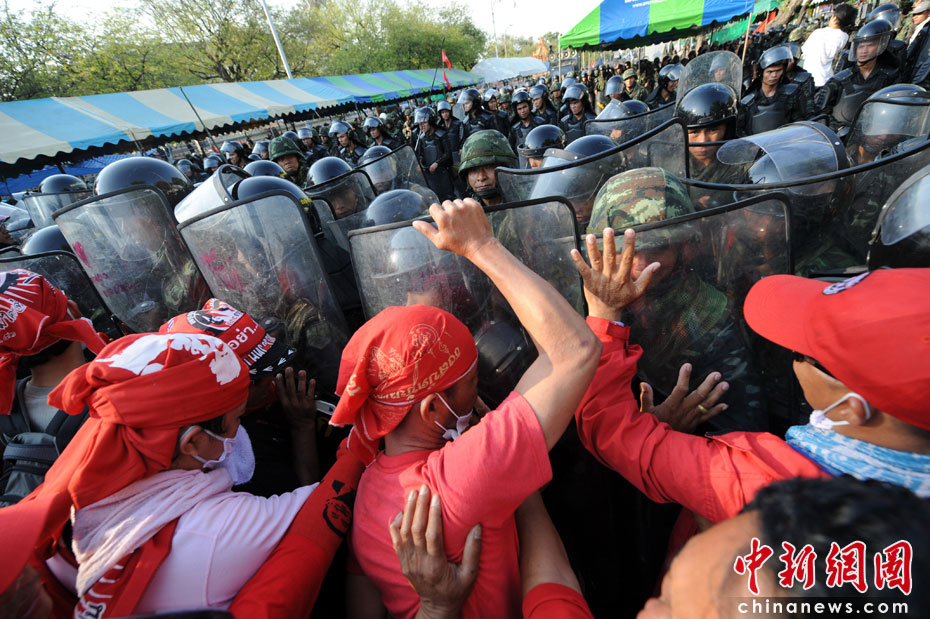 4月10日,泰國(guó)軍隊(duì)在首都曼谷對(duì)支持前總理他信的“紅衫軍”進(jìn)行武力驅(qū)散,雙方爆發(fā)嚴(yán)重沖突,目前已造成18人死亡,數(shù)百人受傷。圖片來源:中國(guó)新聞網(wǎng)