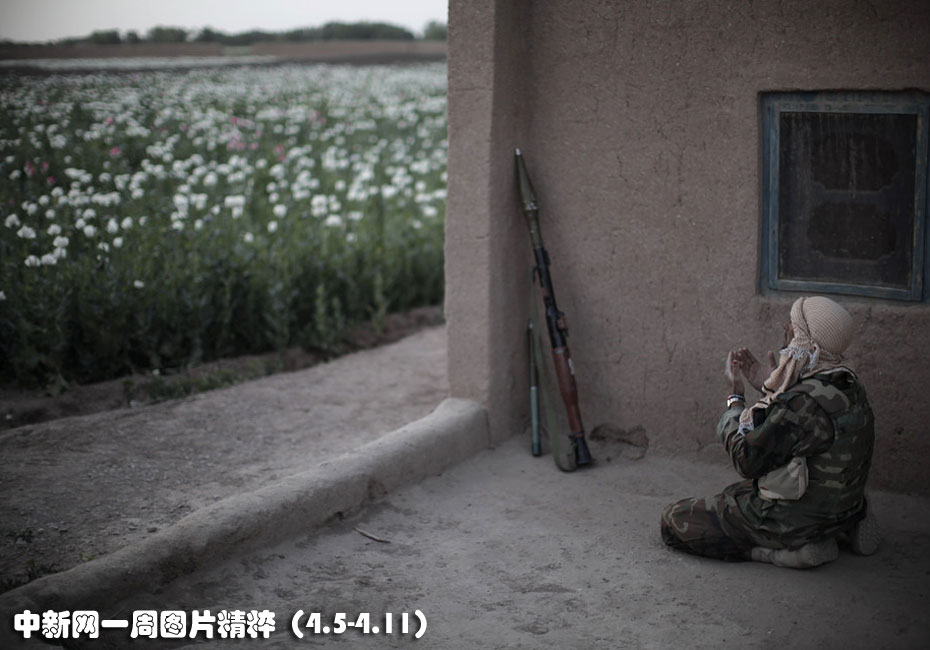 4月5日周一,在阿富汗南部赫爾曼德省馬爾賈地區(qū)的一處塔利班據(jù)點(diǎn),一名與未攝入鏡頭的美國(guó)海軍陸戰(zhàn)隊(duì)士兵徒步巡邏的阿富汗國(guó)家安全部隊(duì)?wèi)?zhàn)士正在進(jìn)行禱告,他的面前是一大片盛開(kāi)的罌粟花。