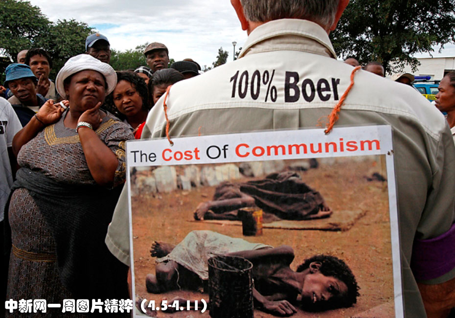 4月6日周二,在南非小鎮(zhèn)文特斯多,被害“白人至上”領(lǐng)導(dǎo)人尤金•特雷布蘭奇的一名支持者(圖右,背對(duì)鏡頭者)站在法院門(mén)外對(duì)人群講話。