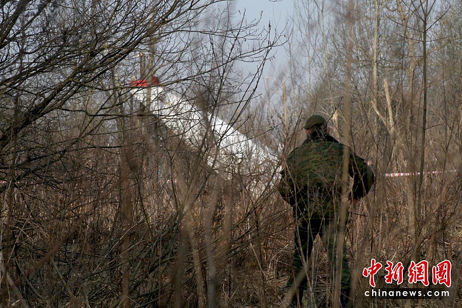 4月11日,波蘭總統(tǒng)卡欽斯基專機在俄羅斯斯摩棱斯克軍用機場墜毀地點附近的道路開通,但是警戒線核心區(qū)仍然關閉。俄波調(diào)查人員正在現(xiàn)場工作。圖片來源:中國新聞網(wǎng)