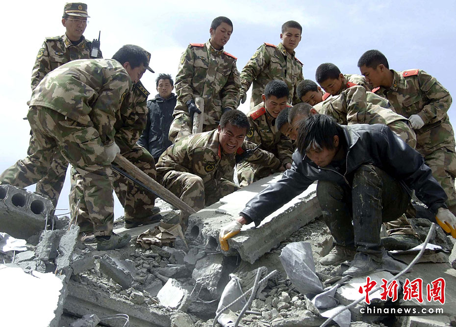 圖為4月14日,武警玉樹支隊(duì)的戰(zhàn)士和玉樹當(dāng)?shù)孛癖姽餐仍焕У拿癖。中新社發(fā) 于文群 攝