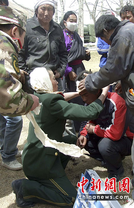 圖為4月14日15時,武警玉樹支隊駐地,一名在地震中受傷的武警戰(zhàn)士救治當(dāng)?shù)厥軅癖。中新社發(fā) 李恩權(quán) 攝