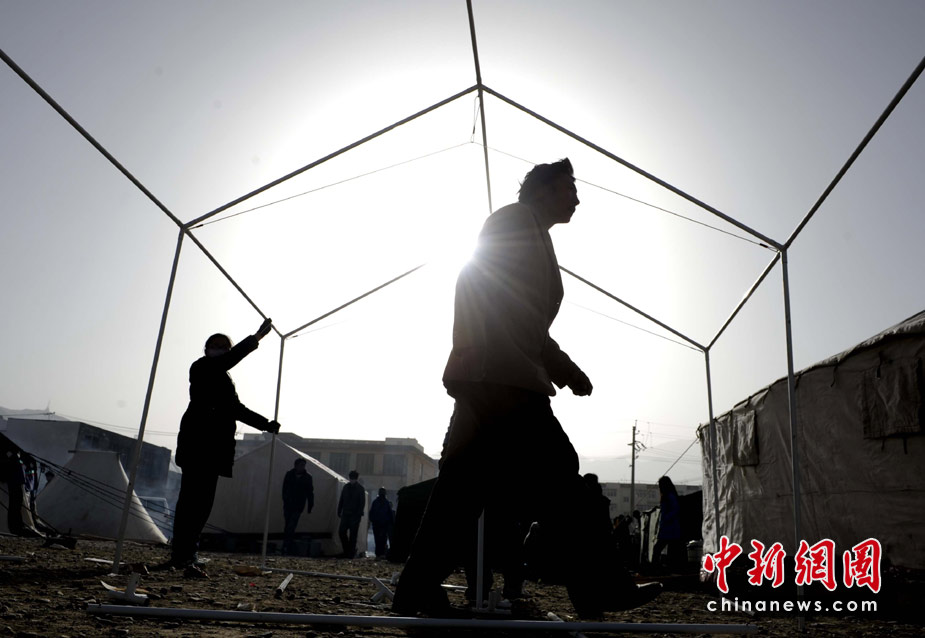 4月15日,青海玉樹縣體育場的地震災(zāi)民安置點(diǎn)內(nèi),玉樹地震災(zāi)民正在積極自建抗震帳棚。中新社發(fā) 廖攀 攝
