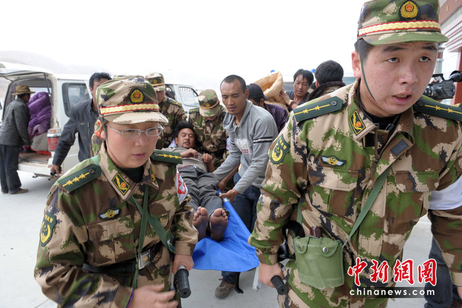 4月15日下午,云南邊防總隊(duì)醫(yī)療救援隊(duì)剛下飛機(jī)立即投入傷員轉(zhuǎn)移工作。圖為官兵們?cè)谟駱錂C(jī)場(chǎng)從救護(hù)車上抬下地震危重傷員,進(jìn)行轉(zhuǎn)移安置和治療。中新社發(fā) 陳文 攝