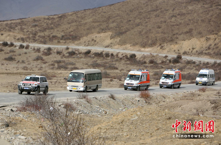 4月16日,四川省衛(wèi)生廳從成都派出首支國家醫(yī)療救援隊經(jīng)過1200余公里,40小時的長途跋涉,醫(yī)療救援車隊平安抵達青海省玉樹地震重災區(qū)。圖為醫(yī)療車隊正在翻越海拔5000多米的海子山。中新社發(fā) 劉忠俊 攝