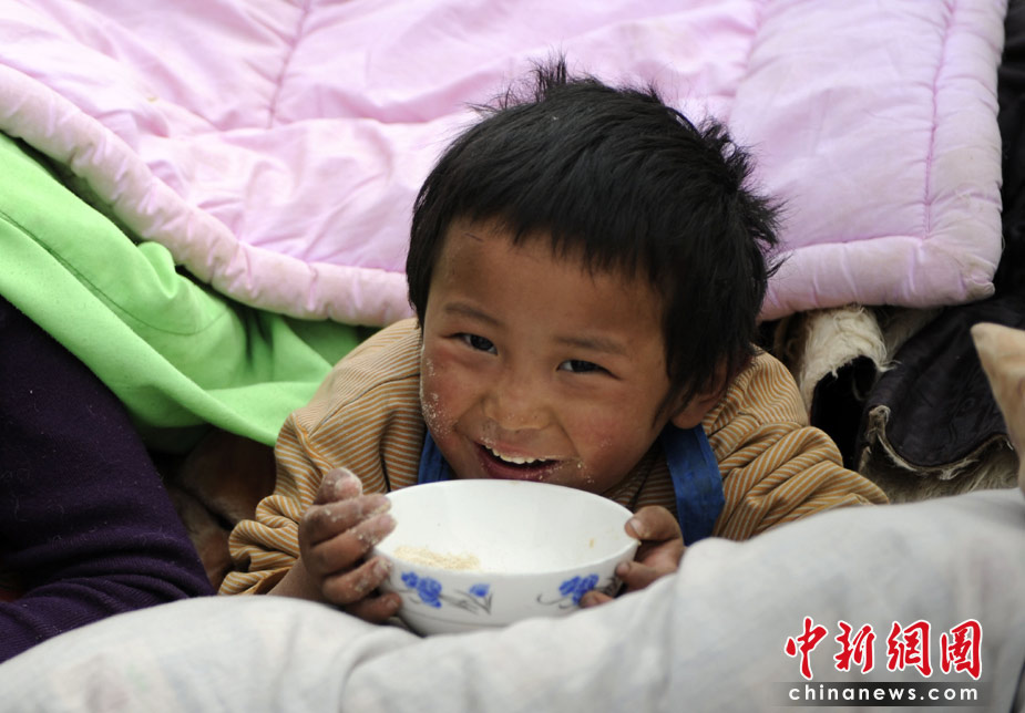 4月16日,青海玉樹體育場地震民眾安置點,一名孩童歡快地吃東西。 中新社發(fā) 廖攀 攝