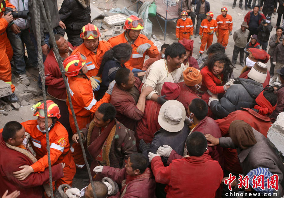2010年4月16日13:50分左右,青海省玉樹藏族自治州玉樹縣地震發(fā)生第三天,在中心城區(qū)一垮塌賓館現(xiàn)場(chǎng)一名被埋54小時(shí)13歲的才珍拉姆被國(guó)家地震局應(yīng)急救援隊(duì)等成功救出。4月14日07時(shí)49分許,青海省玉樹藏族自治州玉樹縣(北緯33.1,東經(jīng)96.7)發(fā)生7.1級(jí)地震。中新社發(fā) 劉忠俊 攝