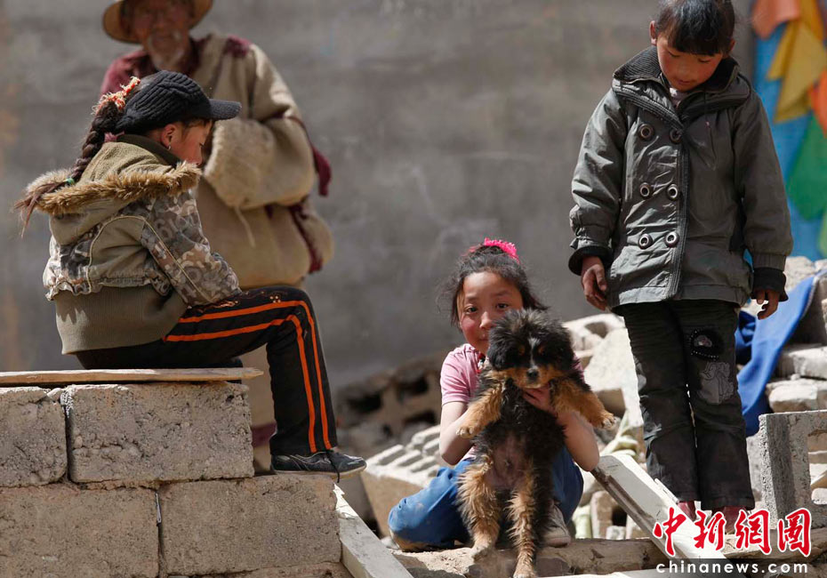 2010年4月16日,青海玉樹藏族自治州玉樹縣結(jié)古鎮(zhèn),兩名兒童在地震的廢墟上與小狗玩耍。中新社發(fā) 盛佳鵬 攝