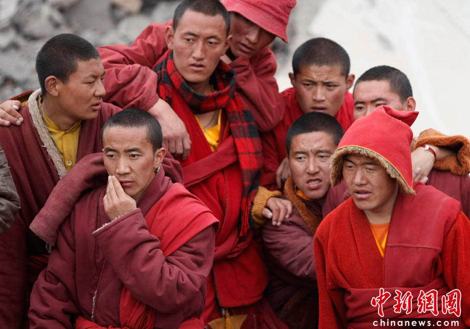 4月16日,青海玉樹結(jié)古鎮(zhèn)震災救援現(xiàn)場,當?shù)厣畟H在救援現(xiàn)場關(guān)注進展情況。中新社發(fā) 盛佳鵬 攝