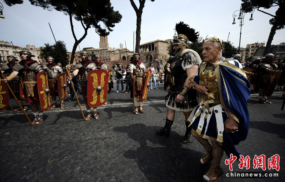 4月18日,意大利羅馬,男子打扮成武士在圓形競(jìng)技場(chǎng)附近參加游行,慶祝羅馬建城2763周年。圖片來(lái)源:中國(guó)新聞網(wǎng)
