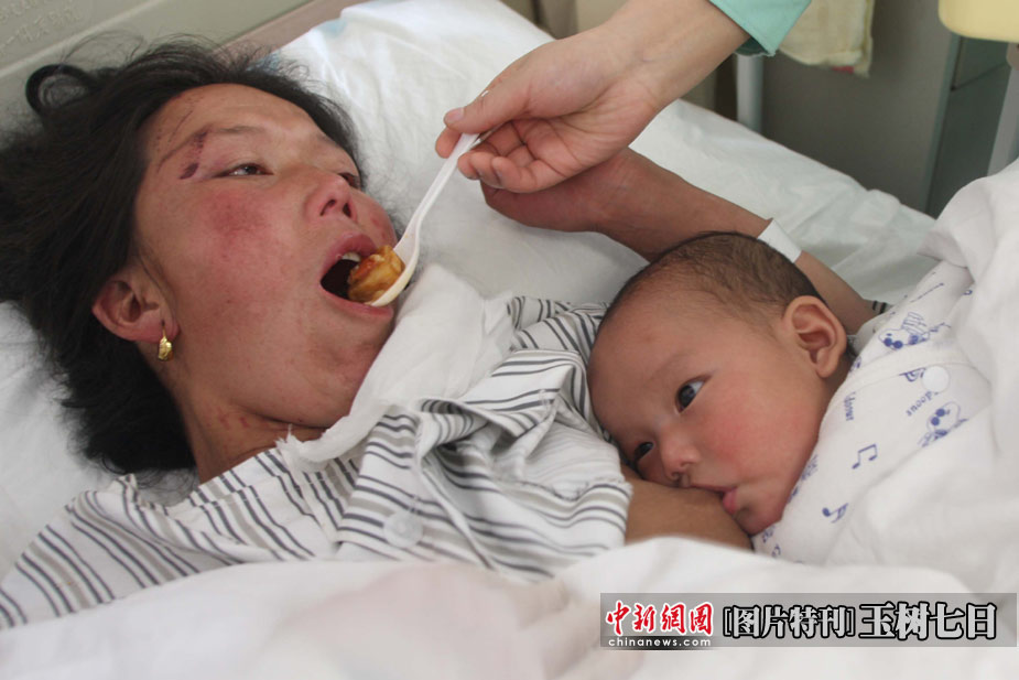 4月16日上午,護士正在給地震傷員30歲的尼瑪曲忠喂飯,她懷中4個月大的孩子正在吃奶。中新社發(fā) 梁萌 攝