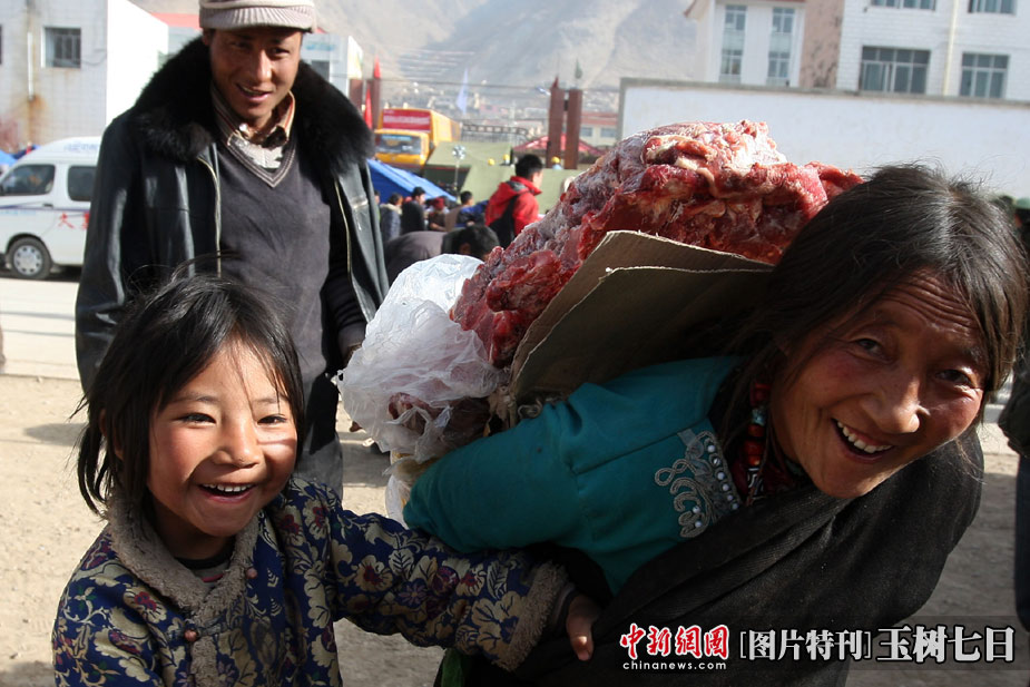 4月18日,青海玉樹體育場受災(zāi)民眾安置點內(nèi),得到副食品的祖孫倆笑容滿面。中新社發(fā) 盛佳鵬 攝