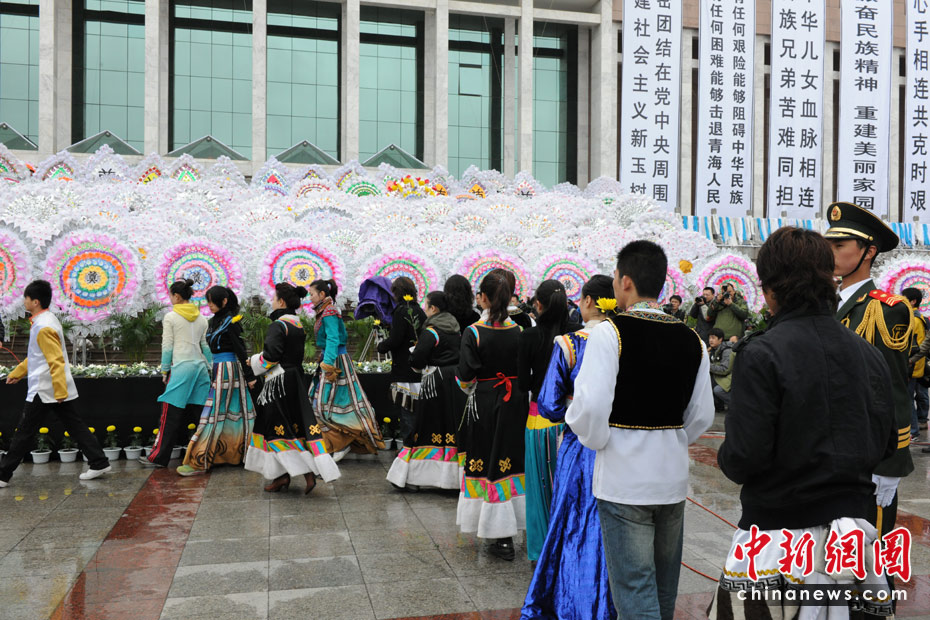 21日上午9時(shí)許,西寧各界民眾冒雪陸續(xù)來到該市最大的廣場(chǎng)——新寧廣場(chǎng),悼念玉樹地震遇難同胞。中新社記者 符永康 攝