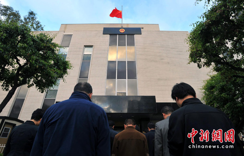 當(dāng)?shù)貢r(shí)間4月21日清晨,中國(guó)駐洛杉磯總領(lǐng)事館在總領(lǐng)館大樓前舉行降半旗儀式,向青海玉樹地震遇難同胞表示深切悼念。中新社發(fā) 張煒 攝