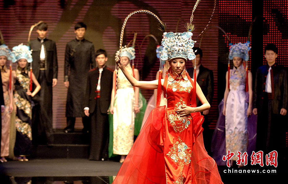 4月20日晚,首屆海西國際時(shí)裝周在福建石獅閉幕,本屆時(shí)裝周吸引了來自海峽兩岸的紡織服裝界企業(yè)家和知名服裝設(shè)計(jì)師。期間舉辦了12場時(shí)裝品牌和設(shè)計(jì)師作品動(dòng)態(tài)發(fā)布會(huì)。圖為模特展示古今潮流結(jié)合的服裝。王東明 攝