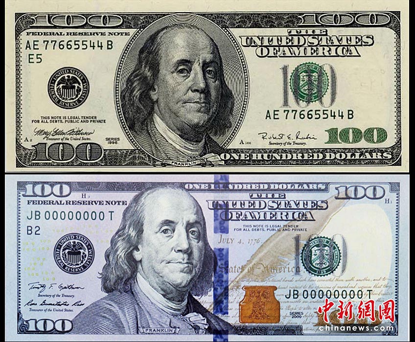 4月21日,美國財(cái)政部和美聯(lián)儲(chǔ)共同發(fā)布新版100美元面值的紙幣票樣。此次發(fā)行新版百元美鈔旨在防范假鈔,同時(shí),老版美元仍將繼續(xù)流通。圖片來源:中國新聞網(wǎng)