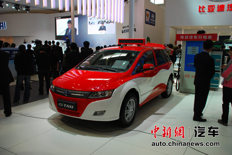 第十一屆北京國(guó)際車展23日開幕,在本屆以“暢想綠色未來”為主題的車展上,新能源車成為最大亮點(diǎn)。圖為比亞迪E6電動(dòng)出租車 王槊 攝