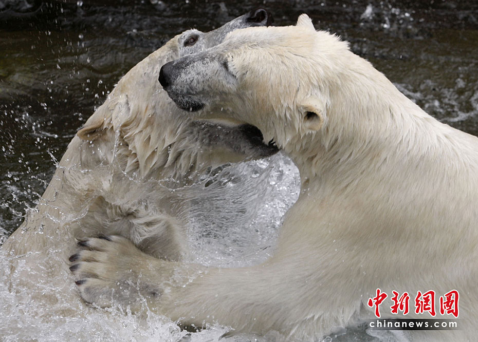 4月23日,德國紐倫堡動物園內(nèi),兩頭北極熊在公園內(nèi)的水池中盡情玩耍,享受春天的陽光。圖片來源:中國新聞網(wǎng)
