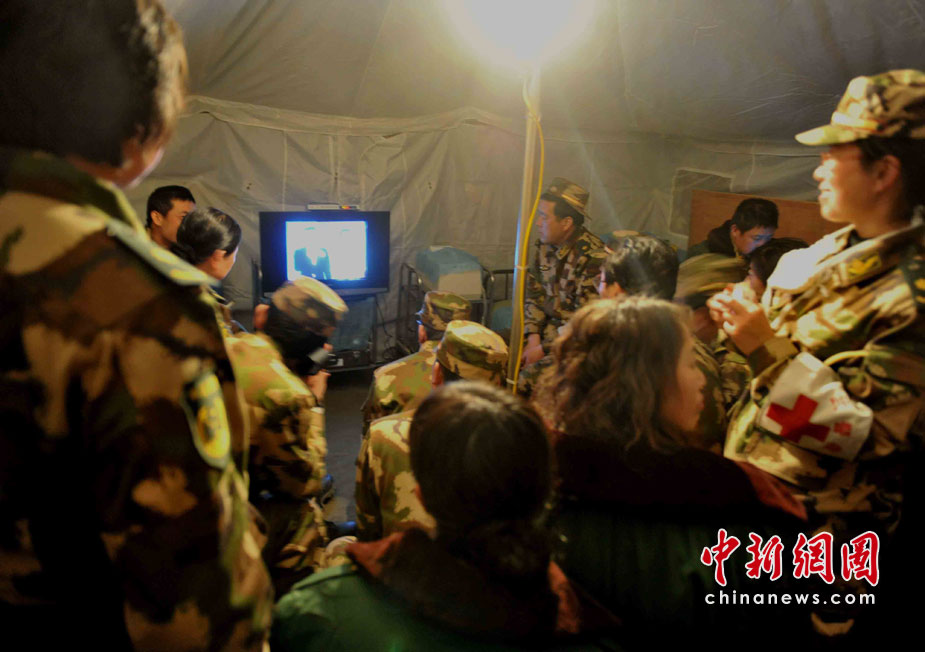 武警青海總隊(duì)玉樹支隊(duì)是最先投入抗震救災(zāi)的先鋒部隊(duì),地震發(fā)生時(shí)恰逢部隊(duì)出操,營房嚴(yán)重受損而官兵平安無恙。這里立即成為抗震救災(zāi)的軍民和媒體的大本營之一,醫(yī)療救護(hù)隊(duì)和新型炊事車晝夜為軍民服務(wù)。集結(jié)在地震災(zāi)區(qū)的各路部隊(duì)從4月低之前全面轉(zhuǎn)入安置群眾和災(zāi)后重建,這里的的后勤已經(jīng)得到基本保障。 中新社記者 賈國榮 攝