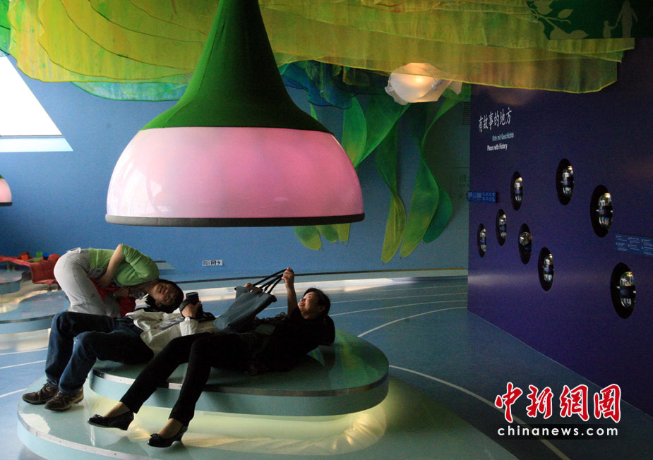 4月27日,三位年輕女記者在上海世博會(huì)德國(guó)館內(nèi)以各種獨(dú)特的姿勢(shì)探秘故事。當(dāng)天,上海世博會(huì)組織者特邀注冊(cè)媒體參觀部分場(chǎng)館。中新社發(fā) 潘索菲 攝