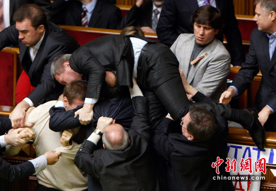 4月27日,基輔,烏克蘭議會就俄羅斯黑海艦隊駐扎問題進行討論時出現(xiàn)混亂,數(shù)千人在議會外示威,會場內(nèi)有人投擲煙霧彈和雞蛋,大廳內(nèi)煙霧彌漫,場面一度混亂。