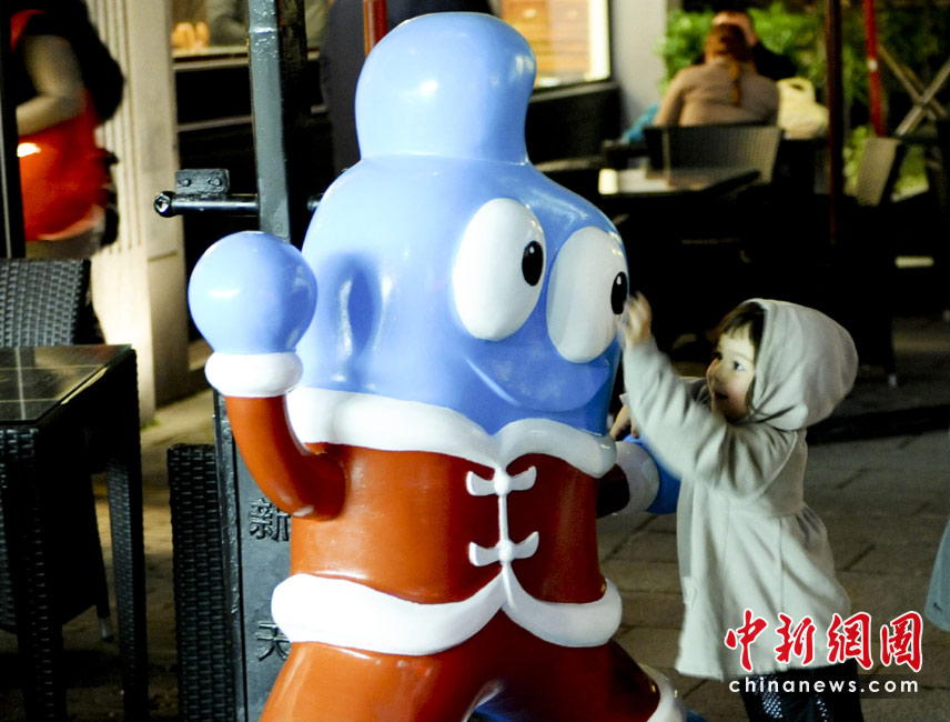 4月26日,一名外國小女孩在上海新天地的食肆內(nèi)玩味世博會吉祥物海寶。世博會開幕在即,面臨“大考”的上海充滿喜慶氣氛。 中新社發(fā) 廖攀 攝