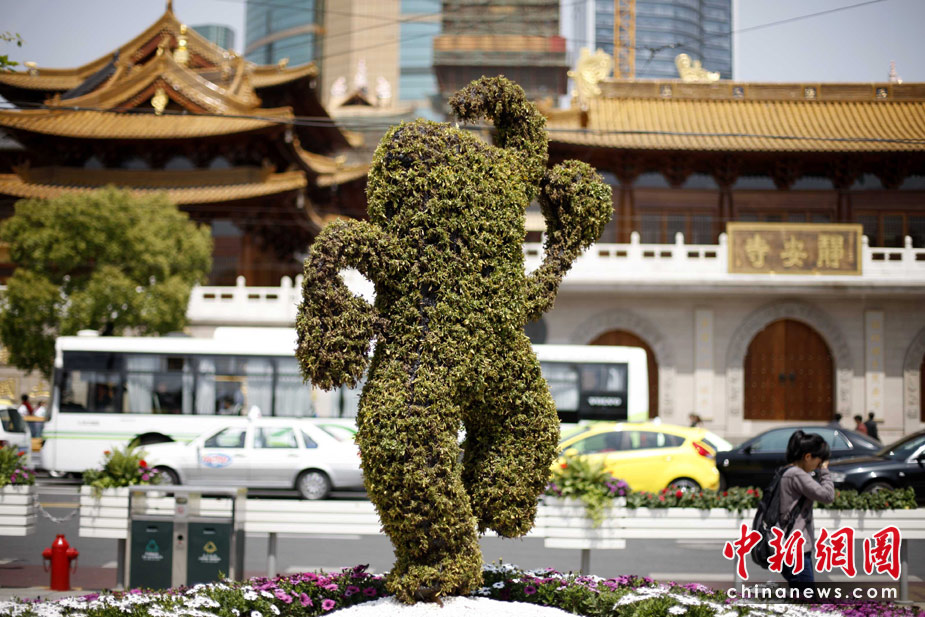 4月29日,上海靜安寺前的海寶造型花壇。世博會(huì)開幕前,面臨“大考”的上海充滿喜慶氣氛。中新社發(fā) 盛佳鵬 攝