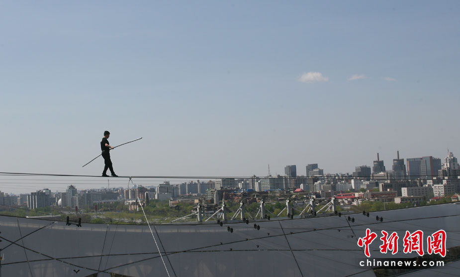 4月29日,有高空王子之稱的新疆小伙阿迪力在鳥巢上空成功試演達瓦孜(高空走鋼絲)。5月3日起,他將在北京國家體育場(鳥巢)頂棚上搭建的小屋生存60天,其間每天將進行約5個小時的高空走鋼絲表演。 中新社發(fā) 蘇丹 攝
