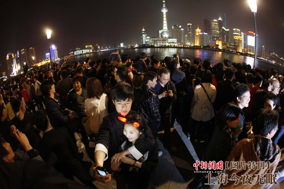 4月30日,上海世博會(huì)開幕,黃浦江畔火樹銀花姹紫嫣紅,這座夢(mèng)想成真城市的千萬居民,在這個(gè)注定難忘的夜晚盡情燃燒和釋放著自己的激情。圖為一對(duì)情侶在擁擠的外灘合影。中新社發(fā) 盛佳鵬 攝