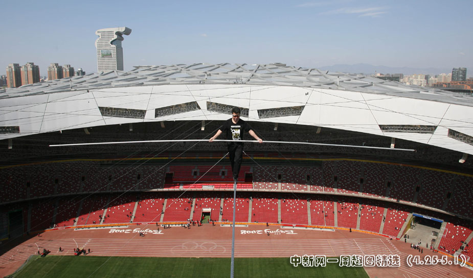 4月29日,有高空王子之稱的新疆小伙阿迪力在鳥巢上空成功試演達(dá)瓦孜(高空走鋼絲)。5月3日起,他將在北京國家體育場(鳥巢)頂棚上搭建的小屋生存60天,其間每天將進(jìn)行約5個小時(shí)的高空走鋼絲表演。 圖片來源:中國新聞網(wǎng)>>點(diǎn)擊觀看詳細(xì)內(nèi)容