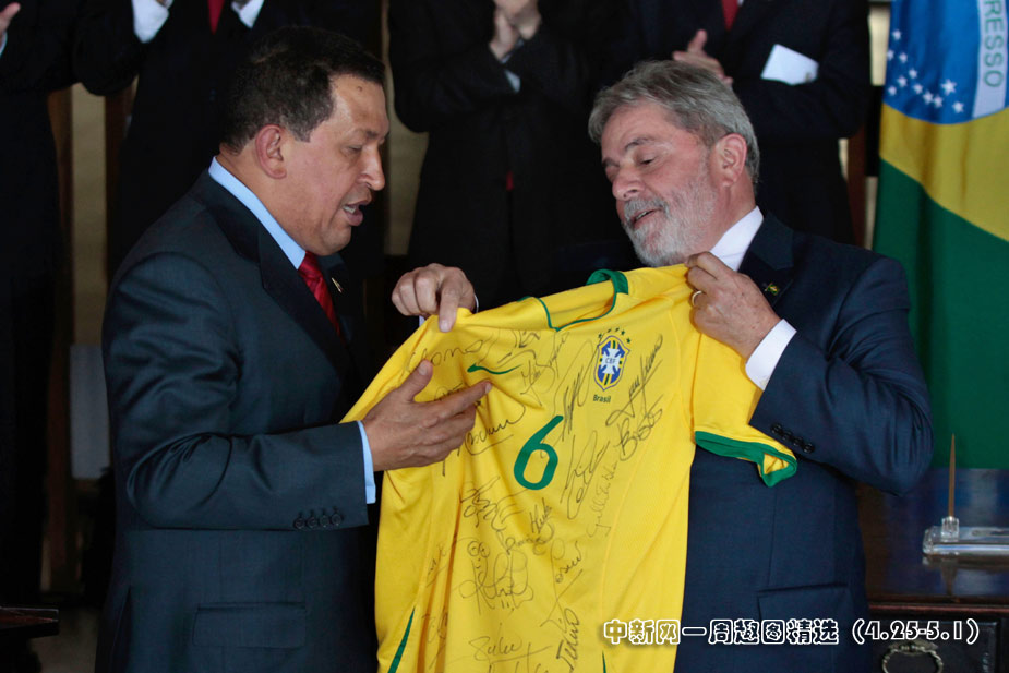 4月28日,巴西總統(tǒng)盧拉在巴西利亞伊塔馬拉蒂宮向來(lái)訪的委內(nèi)瑞拉總統(tǒng)查韋斯贈(zèng)送由巴西球星簽名的球衣。圖片來(lái)源:中國(guó)新聞網(wǎng)>>點(diǎn)擊觀看詳細(xì)內(nèi)容