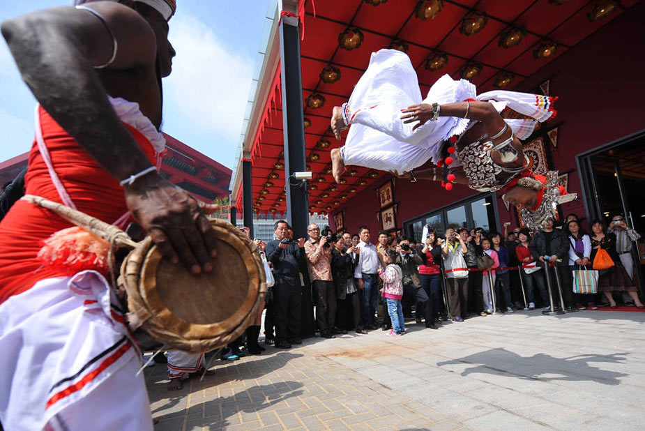 5月1日,上海世博會(huì)正式開(kāi)園迎客,首批游客入園參觀。圖為斯里蘭卡館門口的舞蹈表演吸引眾多參觀者駐足觀看。 羅曉光 攝