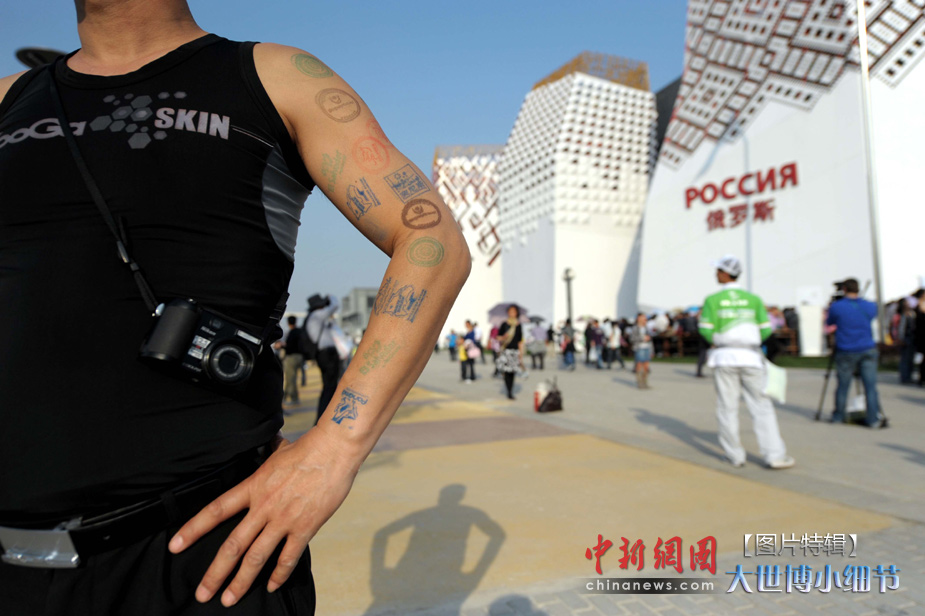 5月1日,上海世博會正式開園,當日有20萬人次的游客參觀了世博園。世博首日,許許多多的小細節(jié)都帶給人一種全新的體驗。圖為一男子胳膊上蓋滿世博園多個展館通行紀念印章,收獲頗豐。中新社發(fā) 陳文 攝