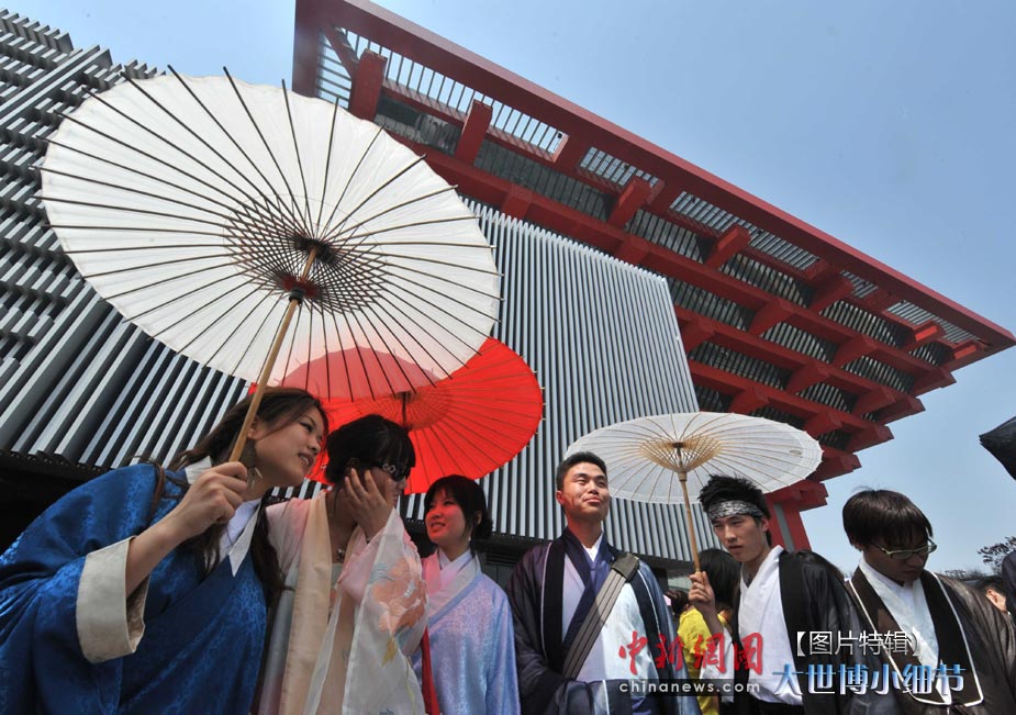 5月1日,上海世博會正式開園,當(dāng)日有20萬人次的游客參觀了世博園。世博首日,許許多多的小細(xì)節(jié)都帶給人一種全新的體驗。圖為大學(xué)生身著古裝游覽中國館。中新社發(fā) 賈國榮 攝