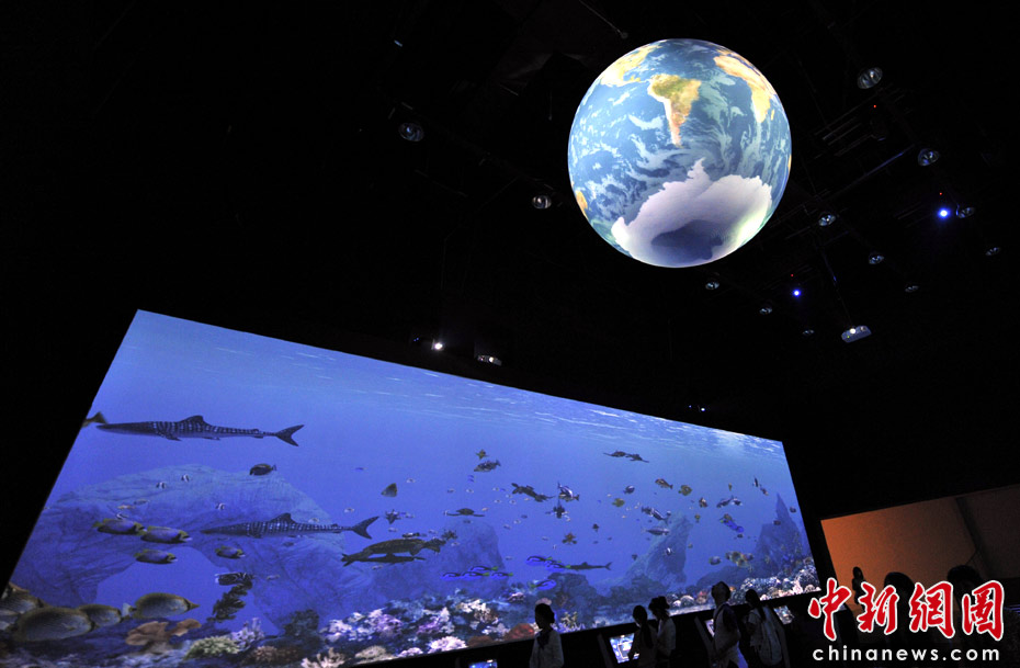 “人與海洋的和諧共存”是2012年麗水世博會的口號,在該展區(qū),游客可以通過電腦屏幕設計一條電子魚,然后“放生”到大屏幕組成的“海洋”中進行水質(zhì)監(jiān)測,這些互動內(nèi)容都引發(fā)游客極大的興趣。中新網(wǎng)記者 王紅綱 攝