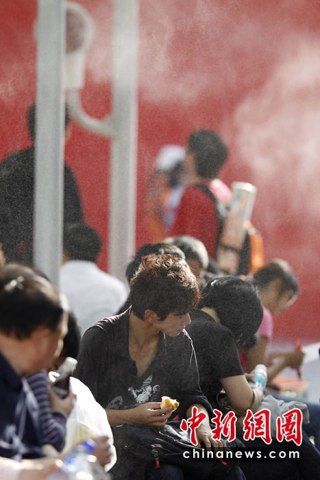 2010年5月2日,上海世博園區(qū)啟動各項控溫降溫設(shè)施應(yīng)對高溫。圖為游客休息區(qū)內(nèi)啟動噴霧降溫系統(tǒng)。中新社記者 盛佳鵬 攝