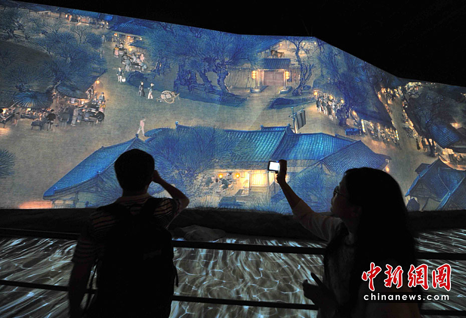 5月2日,中外觀眾依然最熱捧上海世博會(huì)中國(guó)館的“鎮(zhèn)館之寶”——巨幅放大電子動(dòng)態(tài)版的北宋畫(huà)家張擇端名作《清明上河圖》。此世博版的《清明上河圖》高6.3米,長(zhǎng)130余米,約是原圖的30倍,需要12臺(tái)電影級(jí)的投影儀同時(shí)工作。整個(gè)活動(dòng)畫(huà)面以4分鐘為一個(gè)周期,盡展宋朝盛世的都市日夜風(fēng)情。中新社記者 賈國(guó)榮 攝
