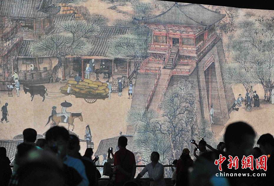 5月2日,中外觀眾依然最熱捧上海世博會(huì)中國(guó)館的“鎮(zhèn)館之寶”——巨幅放大電子動(dòng)態(tài)版的北宋畫家張擇端名作《清明上河圖》。此世博版的《清明上河圖》高6.3米,長(zhǎng)130余米,約是原圖的30倍,需要12臺(tái)電影級(jí)的投影儀同時(shí)工作。整個(gè)活動(dòng)畫面以4分鐘為一個(gè)周期,盡展宋朝盛世的都市日夜風(fēng)情。中新社記者 賈國(guó)榮 攝
