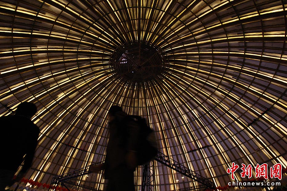 5月2日,上海世博會是第一個正式提出“低碳世博”理念的世博會,圍繞著這樣的理念,上海世博園區(qū)內(nèi)的低碳元素比比皆是。圖為印度館內(nèi)竹制的世界最大穹頂,這個竹制穹頂上方是小型風力發(fā)電裝置和太陽能電池板,為整個場館提供綠色清潔能源。中新社發(fā) 湯彥俊 攝