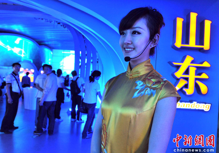 5月3日,上海世博會(huì)中國(guó)山東館一位禮儀小姐始終笑容可掬,許多參觀者都喜歡與外秀內(nèi)慧的她拍一張留影照。當(dāng)一對(duì)夫婦推著嬰兒車(chē)經(jīng)過(guò)時(shí),她迅速上前幫助抬下階梯。她因而享有全場(chǎng)最善解人意的禮儀小姐美稱(chēng)。中新社發(fā) 賈國(guó)榮 攝