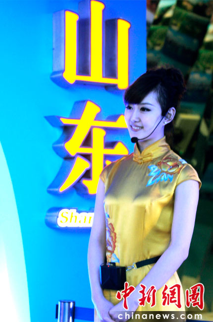 5月3日,上海世博會(huì)中國山東館一位禮儀小姐始終笑容可掬,許多參觀者都喜歡與外秀內(nèi)慧的她拍一張留影照。當(dāng)一對(duì)夫婦推著嬰兒車經(jīng)過時(shí),她迅速上前幫助抬下階梯。她因而享有全場最善解人意的禮儀小姐美稱。中新社發(fā) 賈國榮 攝