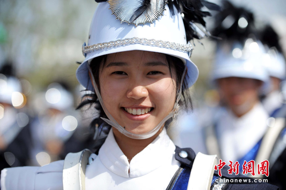 來自泰國南邦甘拉雅尼步操樂團(tuán)的美少女,在上海世博會園區(qū)舉行的“歡樂盛裝大巡游”中引人注目。中新社發(fā) 陳文 攝
